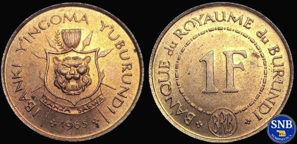El Reino de Burundi surgió tras la independencia de Bélgica. Se intentó reestablecer un antiguo reino nativo africano establecido desde 1688, pretendiendo ser continuadores del mismo. En 1966, ante los abusos de poder y falta de popularidad del rey, se proclamó la república. La única moneda circulante emitida por este efímero reino africano, ya que el resto de las piezas (cuatro o cinco emisiones más), son acuñaciones conmemorativas no circulantes (en su mayoría, de plata y oro), prácticamente inconseguibles.