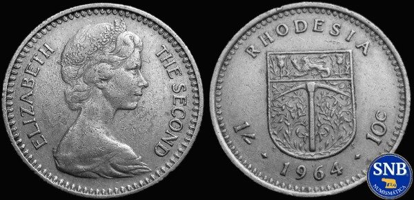 R/: Escudo de armas de la colonia. Arriba: RHODESIA. Debajo del escudo: 1/- · 1964 · 10c.