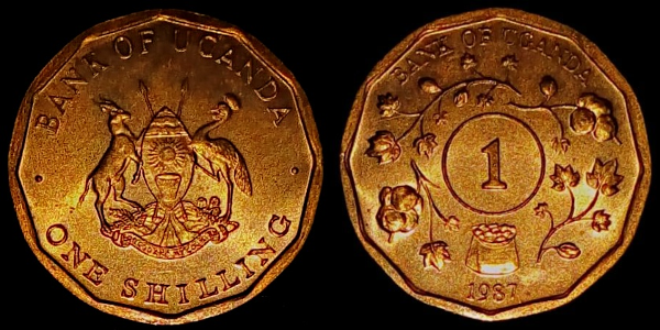 En anverso, el emblema nacional de Uganda. En reverso, planta de algodón y un saco lleno de este producto tras la cosecha.