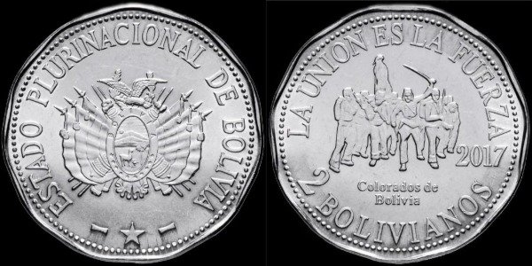 Moneda de buen diámetro que homenajea al Regimiento "Colorados de Bolivia", hoy en día, Escolta del Presidente de ese país. Este regimiento de élite tuvo una destacada actuación durante la Guerra del Pacífico, y en la moneda, se lo homenajea con una escena de batalla ambientada en ese conflicto bélico del siglo XIX.