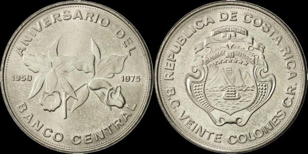 **Escasa moneda conmemorativa costarricense, acuñada en 1975 para celebrar el 25° Anoversario de la creación del Banco Central de ese país centroamericano. Módulo grande y buen peso.**