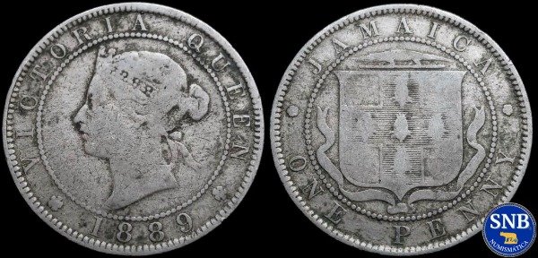 R/: JAMAICA 🏵 ONE PENNY 🏵. Escudo de armas de Jamaica dentro de un círculo de perlas.