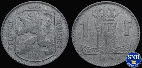 En el anverso, Escudo nacional con leyendas bilingües (francés y flamenco). En el reverso, Monograma coronado del rey Leopoldo III dividiendo la denominación.