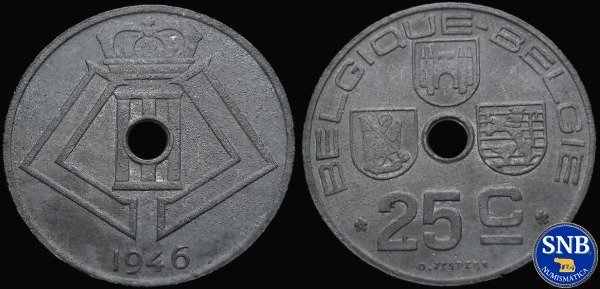 En el anverso, escudos de armas de Bruselas, Mons y Brujas. Leyenda bilingüe: BELGIQUE-BELGIE. En el reverso, monograma real coronado.