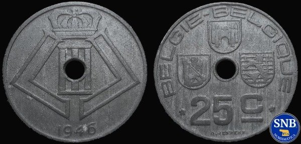 En el anverso, escudos de armas de Bruselas, Mons y Brujas. Leyenda bilingüe: BELGIE-BELGIQUE. En el reverso, monograma real coronado.
