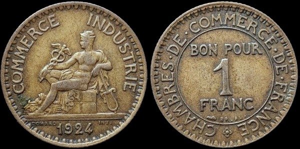 Emitida luego de la Primera Guerra Mundial a nombre de la Cámara de Comercio de Francia ante la falta de circulante. Es por ello que las inscripciones dicen “BON POUR 1 FRANC”, es decir “Bueno por 1 Franco”.