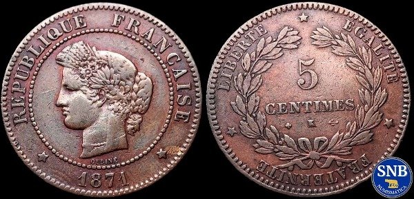 Una de las primeras medidas que tomó el Gobierno de Defensa Nacional fue la acuñación de nuevas monedas, las cuales, ya no llevaban el retrato de Napoleón III y estaban emitidas a nombre de la República Francesa. La mayoría de estas piezas se acuñaron en la ceca de París, y son bastante comunes y accesibles. Sin embargo, en 1871, se acuñó una cantidad muy escasa de piezas en la ceca de Bordeaux (unas 26.000 contra los millones producidas en París). Estas monedas, a diferencia de las parisinas que llevan la letra “A” como marca, llevan la letra “K” en su reverso. Son MUY RARAS.