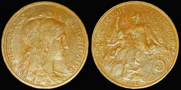 En anverso, busto de Marianne tocada con gorro frigio a derecha. En reverso, Marianne con casco sentada a izquierda con su manto protege a un niño.