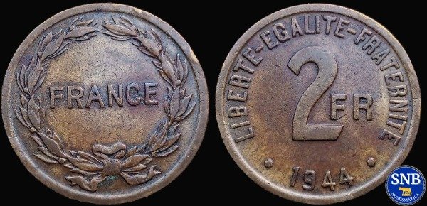 A/: LIBERTE-EGALITE-FRATERNITE. Al centro: 2FR. En exergo: 1944.