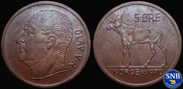 En anverso, cabeza de Olaf V a izquierda. En reverso, un alce euroasiático de pie sobre un terreno llano, mirando hacia la izquierda.