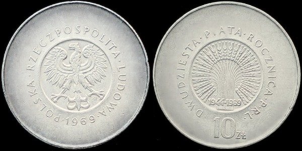 Conmemorativa: 25° Aniversario de la República Popular. Emblema nacional en anverso y una gavilla de trigo con 25 espigas en reverso.