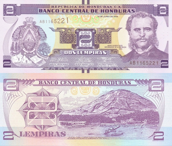 Marco Aurelio Soto, político y abogado, reformador y prócer de Honduras en anverso. En reverso, escena de la Isla del Tigre y puerto de Amapala, sede inicial del gobierno de Soto.