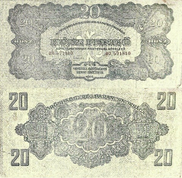 *ESCASO billete militar, emitido por la administración soviética para circular en las zonas liberadas de Hungría mientras aún se combatía contra las fuerzas del Eje.*