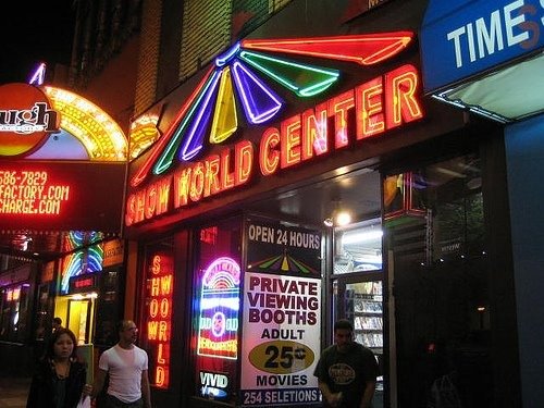El Show World Center, ubicado en la esquina de Eighth Avenue y la 42nd Street en Manhattan, fue uno de los locales emblemáticos del Times Square sórdido que dominó la zona desde los años 1970 hasta los 1990. Era un gigantesco complejo de entretenimiento para adultos, famoso por sus peep shows, cabinas de vídeo, striptease y “live booths” donde bailarinas actuaban detrás de vidrios unidireccionales. Funcionaba las 24 horas y llegó a ser uno de los últimos grandes establecimientos de su tipo cuando el barrio estaba repleto de cines pornográficos, casas de masajes y sex shops. Su notoriedad lo convirtió tanto en símbolo del declive urbano como en referencia cultural del viejo Times Square previo a la “limpieza” impulsada por las administraciones de Giuliani y Bloomberg. Con la transformación de la zona en los años 1990-2000, el Show World sobrevivió un tiempo más, pero terminó cerrando como parte del proceso de gentrificación y renovación de la 42nd Street.