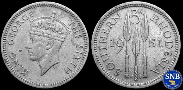R/: SOURTHEN RHODESIA. Tres lanzas nativas y a cada lado: 19-51. Arriba: "3".