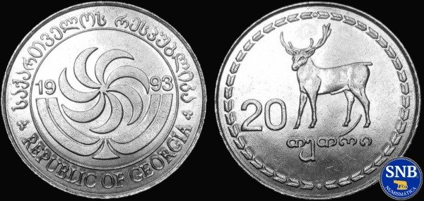 Borjgali, el símbolo georgiano del Sol en el anverso y un ciervo rojo en el reverso.