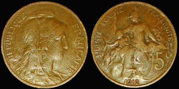 En anverso, busto de Marianne tocada con gorro frigio a derecha. En reverso, Marianne con casco sentada a izquierda con su manto protege a un niño.