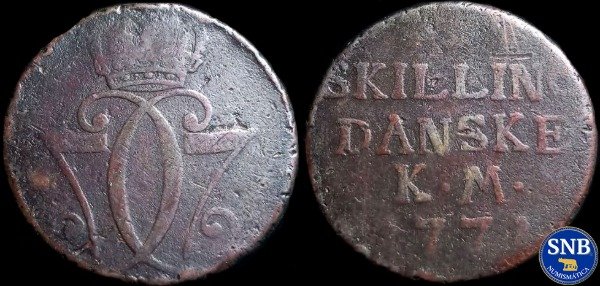 R/: ✤ 1 ✤ / SKILLING / DANSKE / K·M / 1771. Variante 1 ("C" con serif y K.M separado).