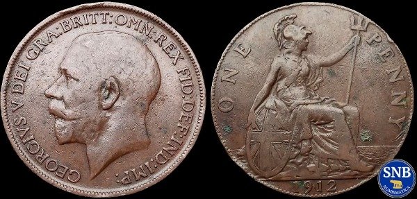 Cabeza descubierta de Jorge V a izquierda y Britania, sosteniendo tridente y escudo de la Unión, sentada a derecha.